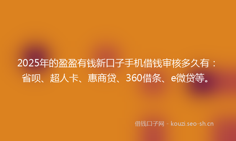 2025年的盈盈有钱新口子手机借钱审核多久有:省呗、超人卡、惠商贷、360借条、e微贷等。
