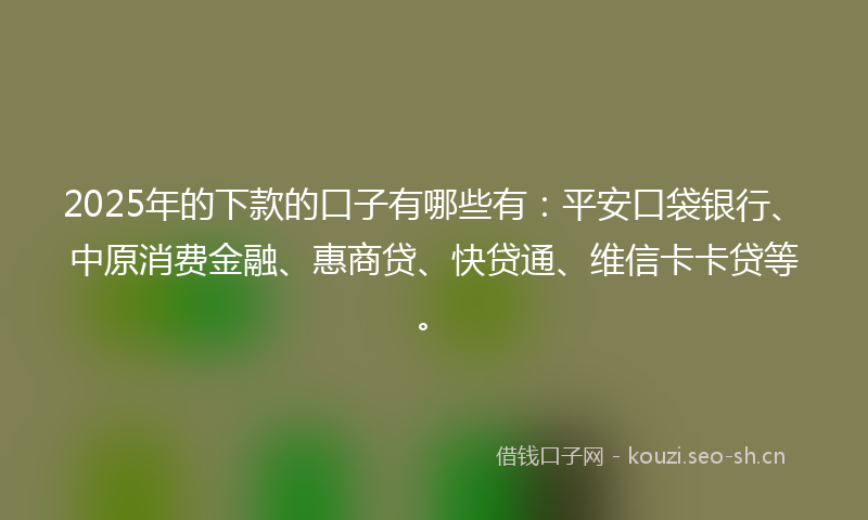 2025年的下款的口子有哪些有:平安口袋银行、中原消费金融、惠商贷、快贷通、维信卡卡贷等。