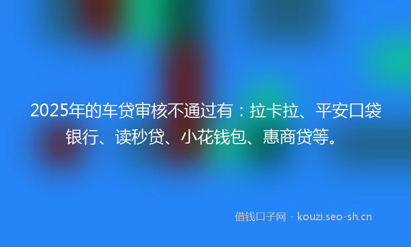 2025年的车贷审核不通过有:拉卡拉、平安口袋银行、读秒贷、小花钱包、惠商贷等。